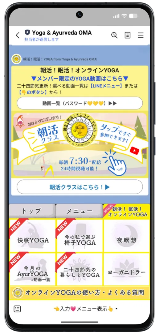 - OMA公式LINEの"朝活!眠活!オンラインYOGAのメニュー"から、24時間いつでも視聴いただけます